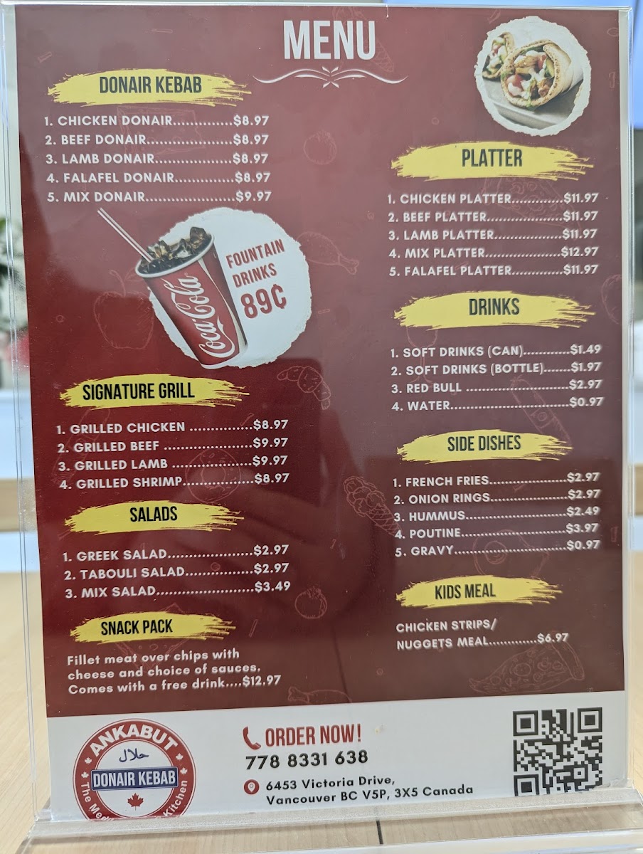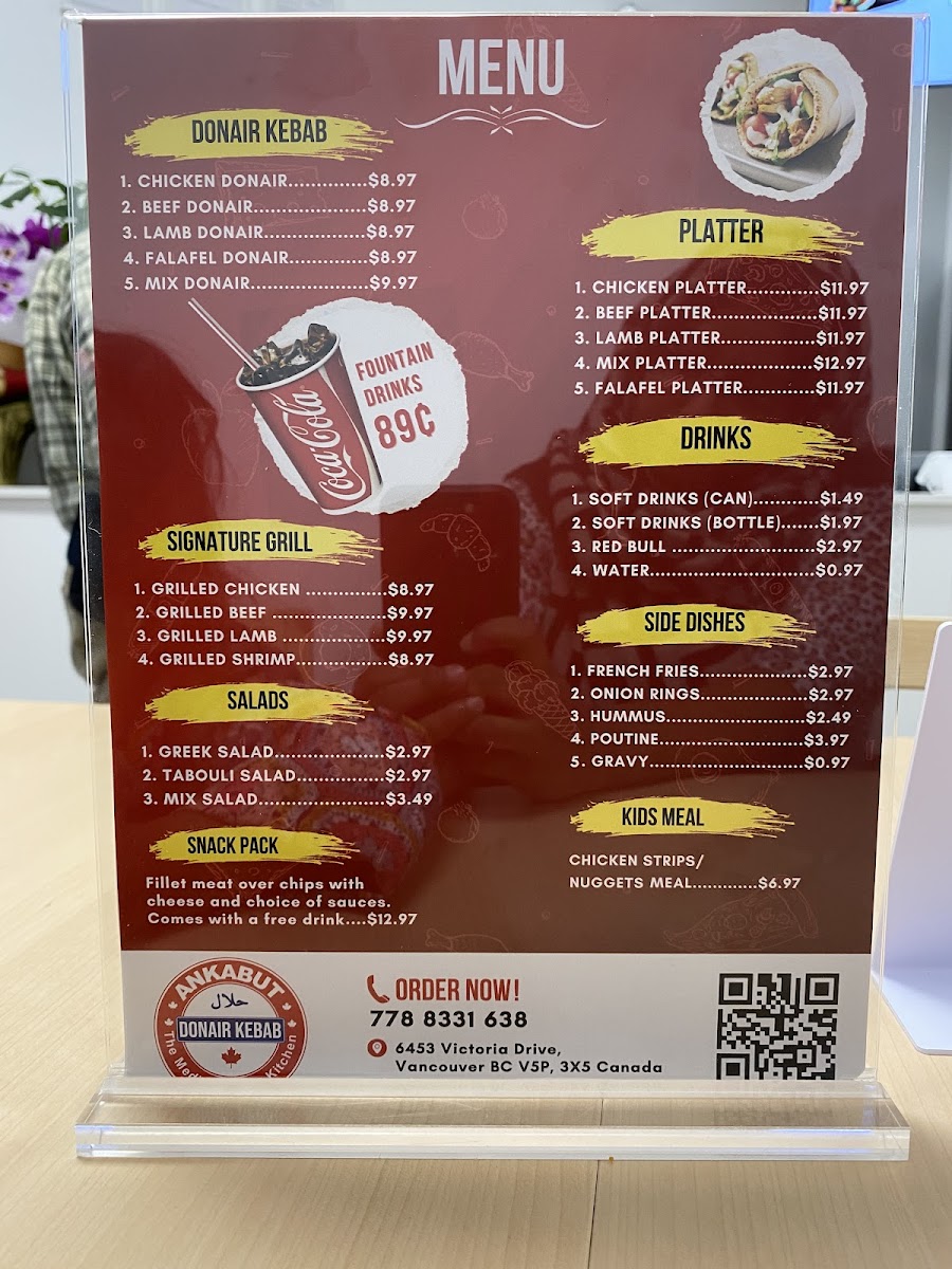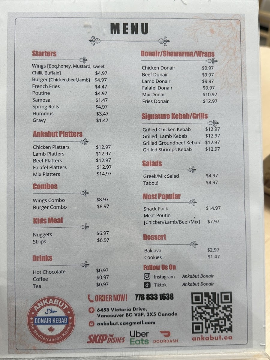 Welcome to Ankabut Donair Kebab & Cafe, a delightful haven for lovers of Middle Eastern cuisine nestled in the heart of Vancouver. Here, the vibrant menu showcases a delectable array of platters featuring your choice of chicken, lamb, or beef, all priced at just CA$12.97. For a taste of plant-based goodness, the falafel platter is a must-try at the same price. For those seeking variety, the mix platter at CA$14.97 offers an exceptional combination.
